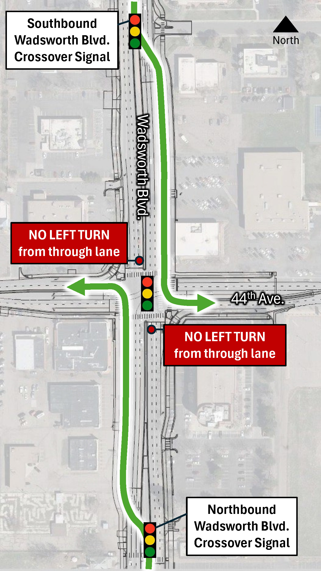 Remember: Do not turn left directly from the northbound or southbound Wadsworth through lane at the 38th and 44th intersections.