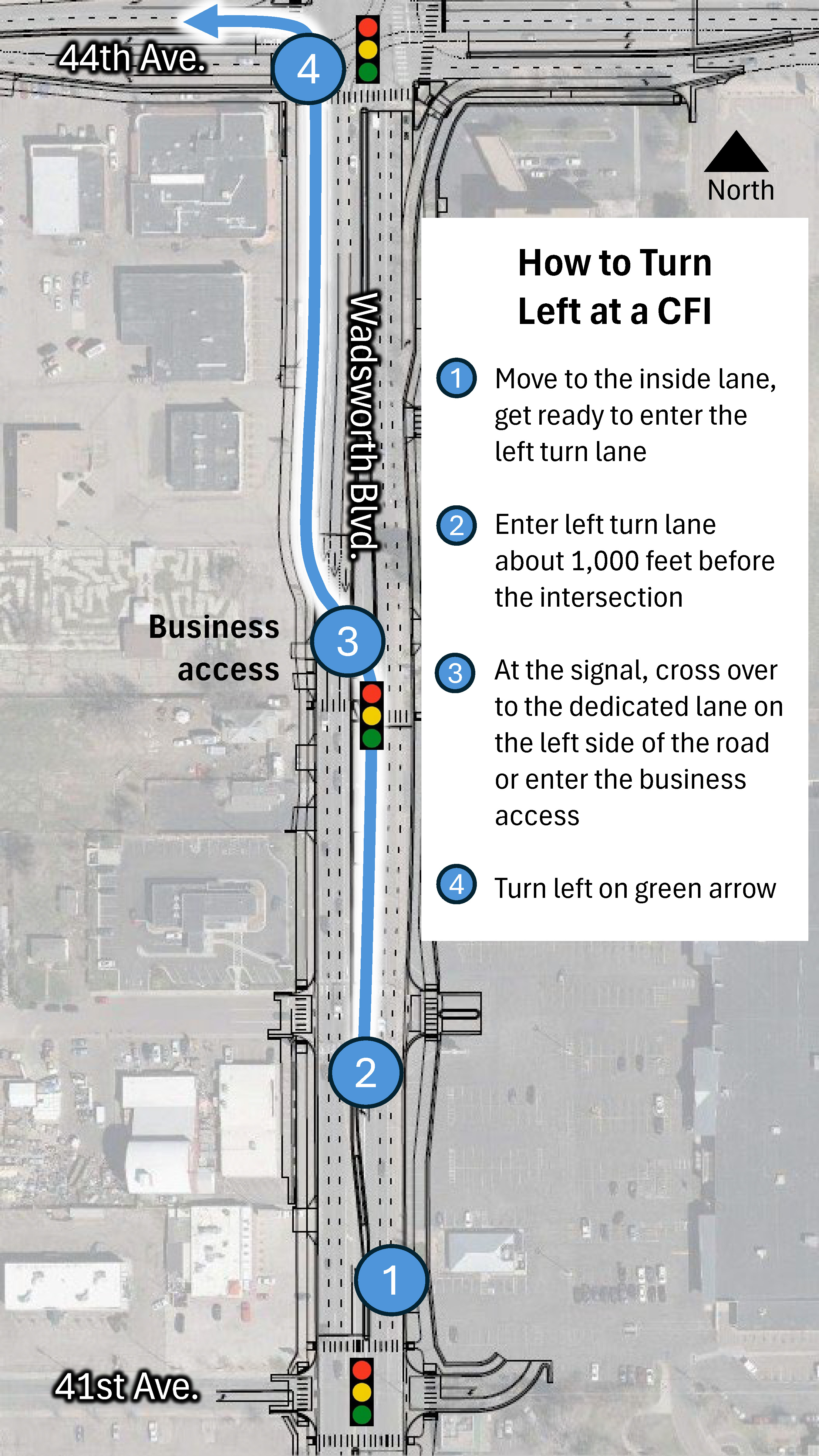 If you miss the CFI lane entrance at the crossover traffic signal, continue straight through the main intersection to the next available location to turn left or make a U-turn safely. Do not turn left directly from the northbound or southbound Wadsworth through lane at the 38th and 44th intersections.